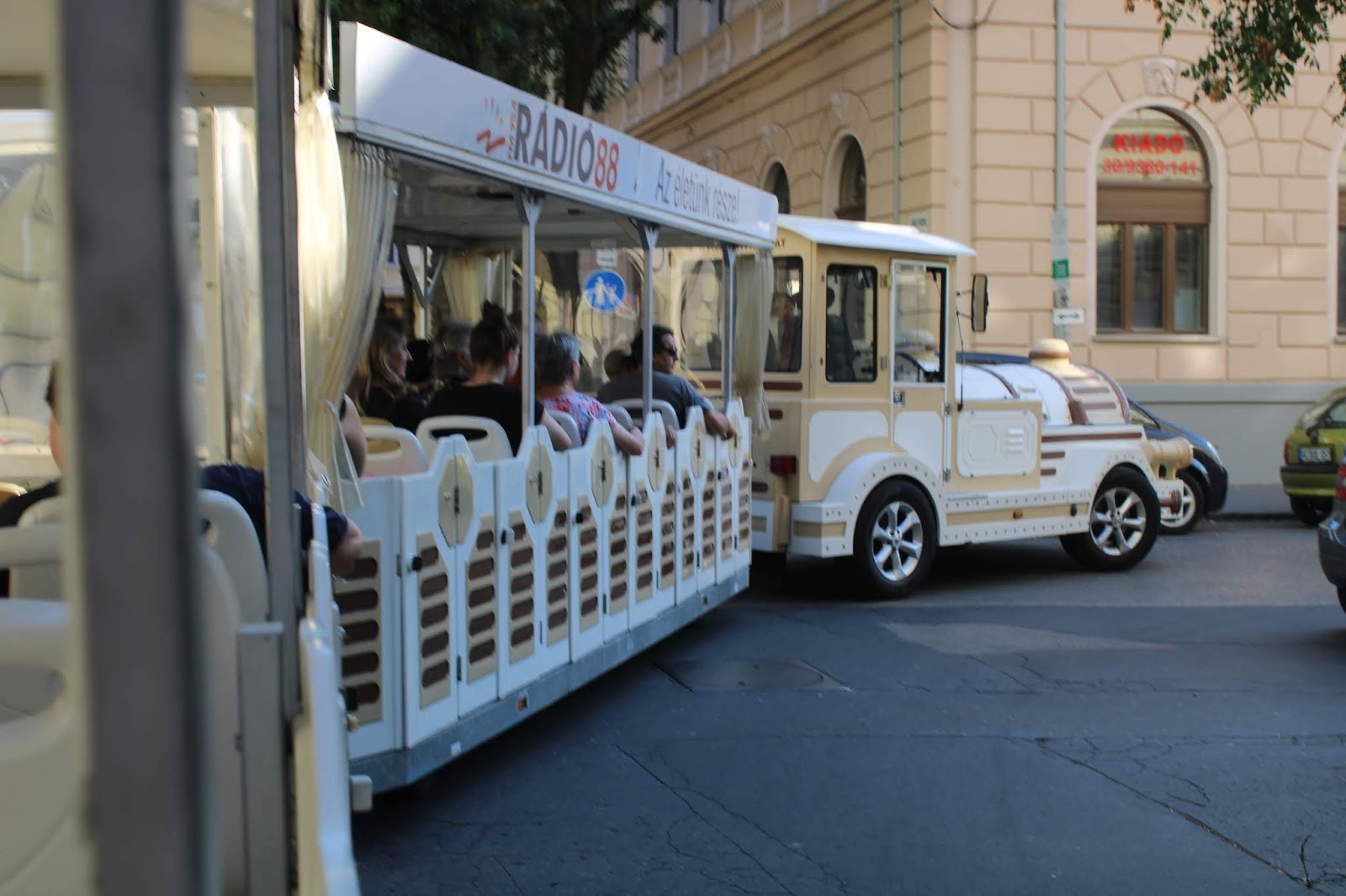 A Széchenyi Térhez érve felfedeztük, hogy itt is van városnéző kis vonat, ami 45 perces útra el is vitt minket keresztül a városon. Rengeteg érdekességet hallottunk a városról. Átvitt minket a hídon is a túlpartra, ahová gyalog nem mentünk volna. Így láttuk a Boszorkányszigetet, és azt a környéket ahol Szentgyörgyi lakott.